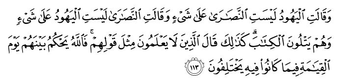 Muhammad Sarwar: The Jews accuse the Christians of having no basis for their religion and the Christians accuse the Jews of having no basis for their religion, even though both sides read the Scripture. The ignorant ones say the same thing. God will issue His decree about their dispute on the Day of Judgment.