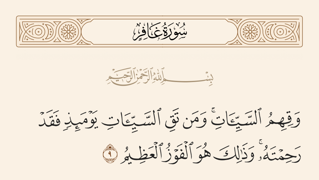Arberry: And guard them against evil deeds; whomsoever Thou guardest against evil deeds on that day, on him Thou hast had mercy; and that is indeed the mighty triumph.