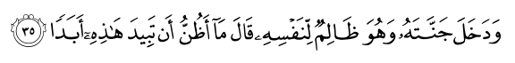 Sahih International: And he entered his garden while he was unjust to himself. He said, "I do not think that this will perish - ever.